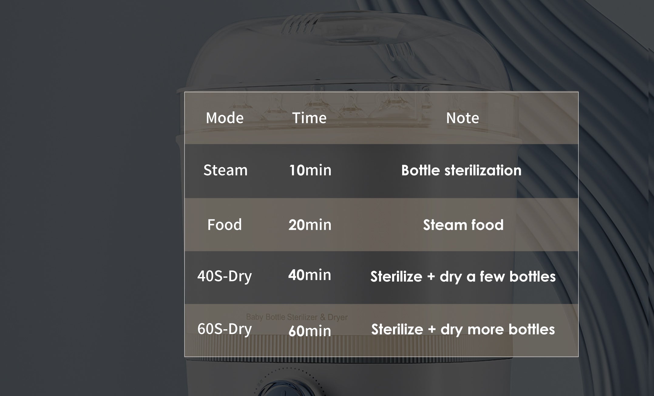 • Sterilizes up to 9 bottles and accessories in one cycle