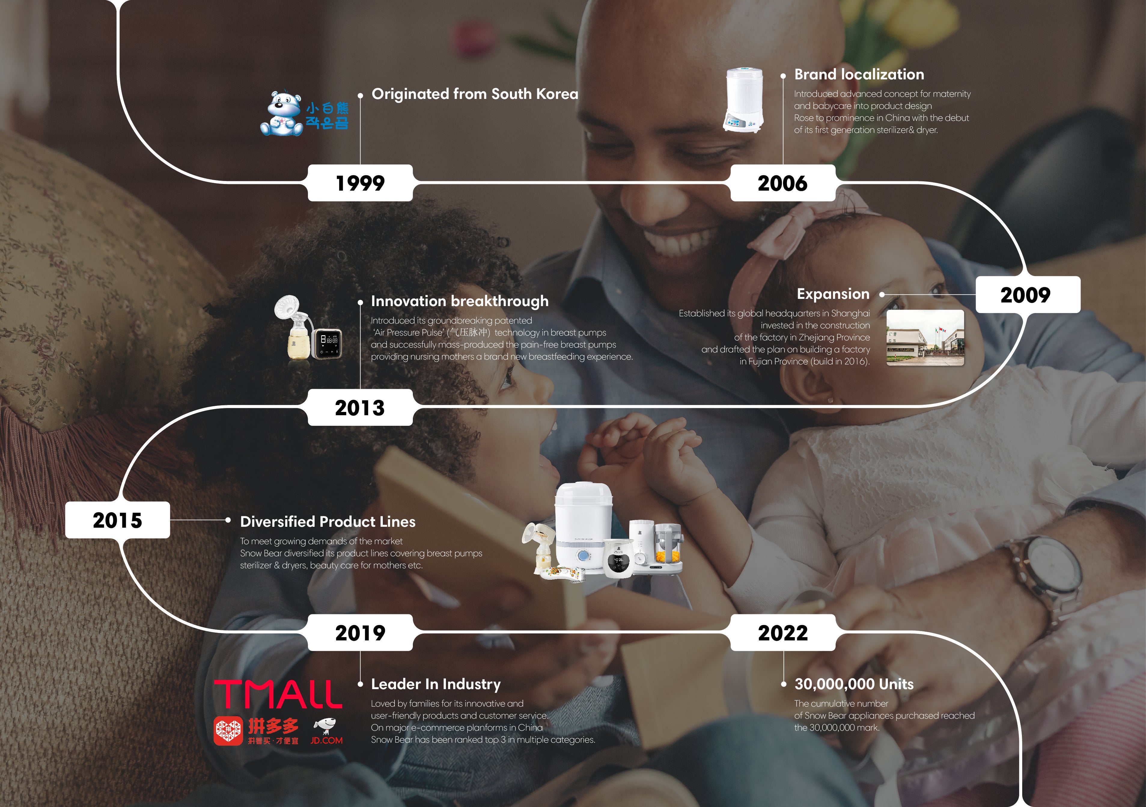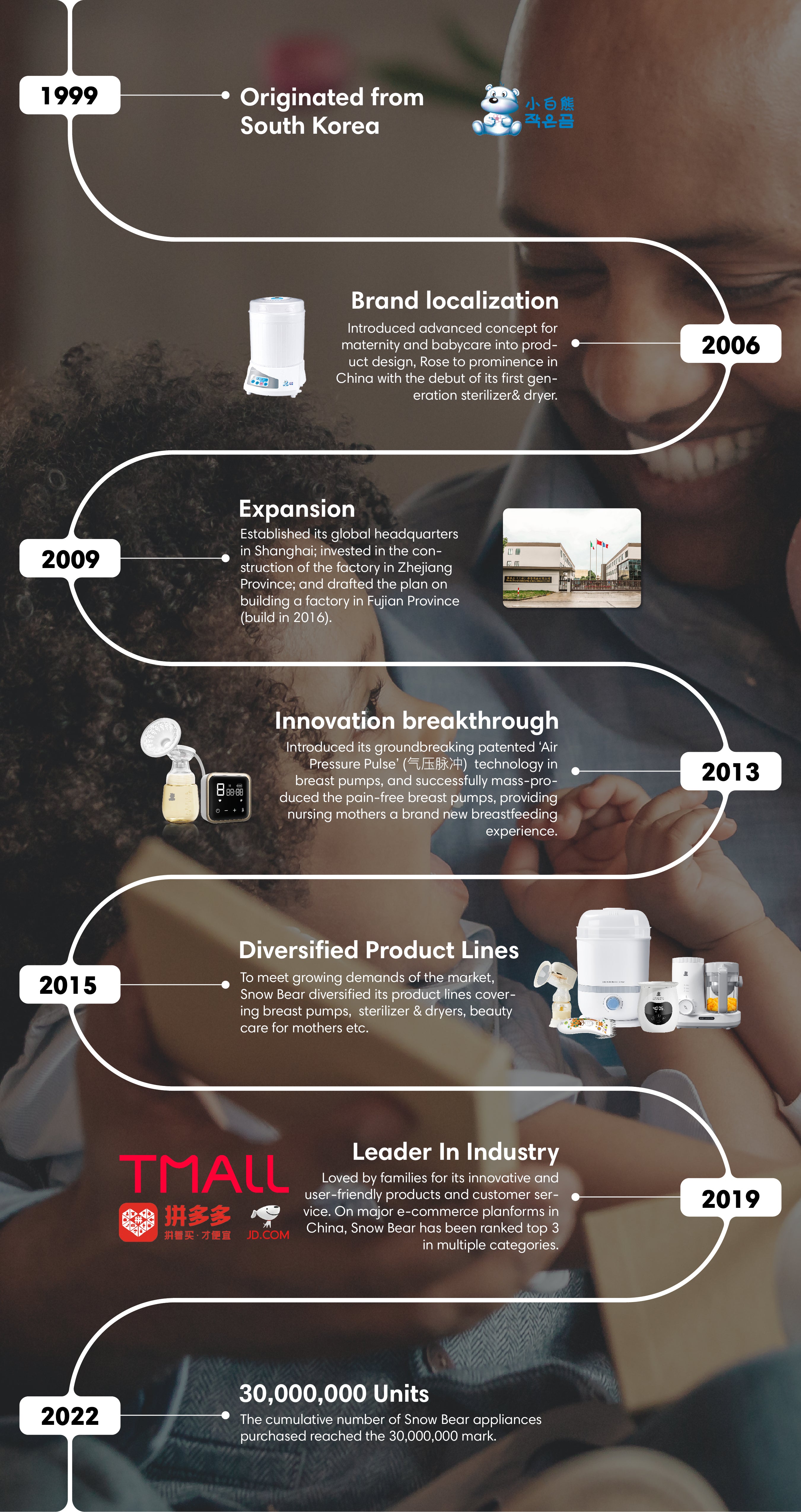 Founded in South Korea in 1999, SnowBear has been localized and became one of the earliest brands in China dedicated to the R&D, manufacture, and promotion of family-oriented maternity and baby products since 2006.