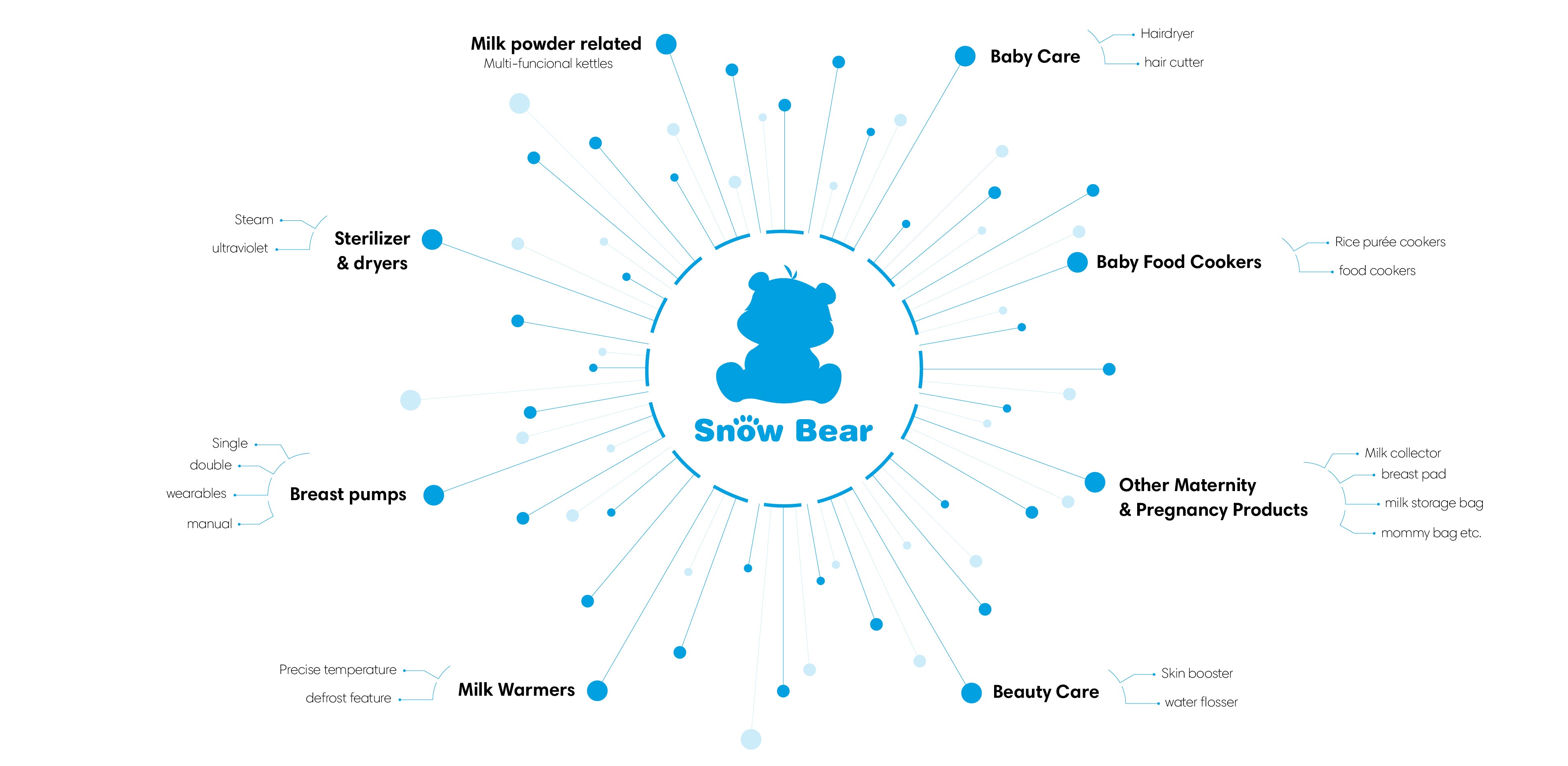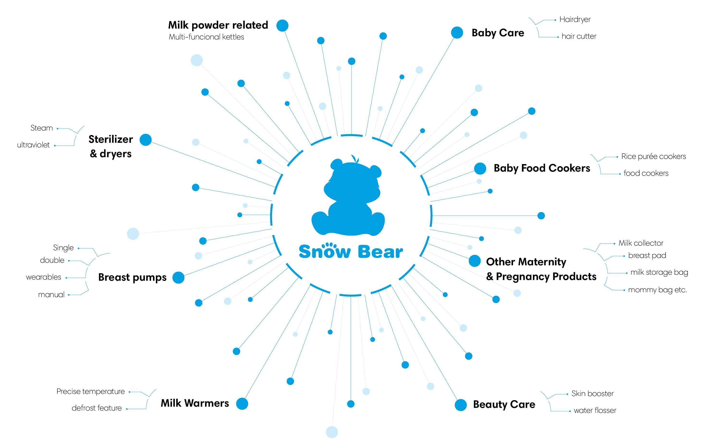 Over the years, SnowBear has been expanding its product lines to meet growing demands with user-friendly technologies and innovations. SnowBear ecosystem covers 5 areas: Maternity & Pregnancy Products, Baby Appliances, Baby Feeding, Baby Care, as well as Beauty Care with over 200 items in total.